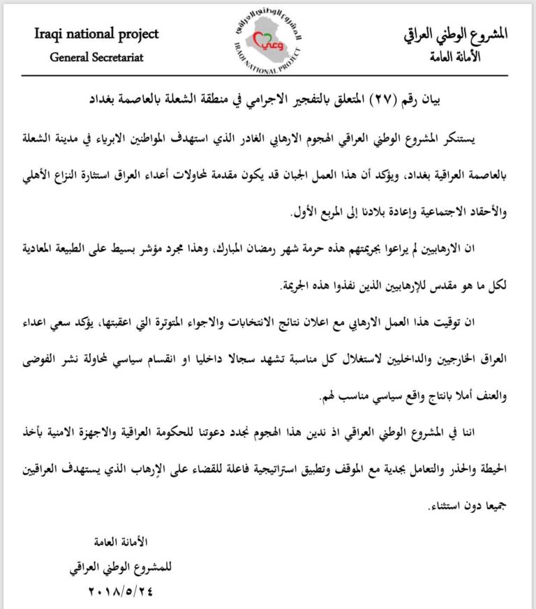 المشروع الوطني العراقي ينعى استشهاد عضو مجلس محافظة بغداد صفاء المشهداني، ويطالب بمحاسبة أصحاب الخطابات الطائفية قضائياً ونبذهم سياسياً واجتماعياًأكتوبر 15, 2025
