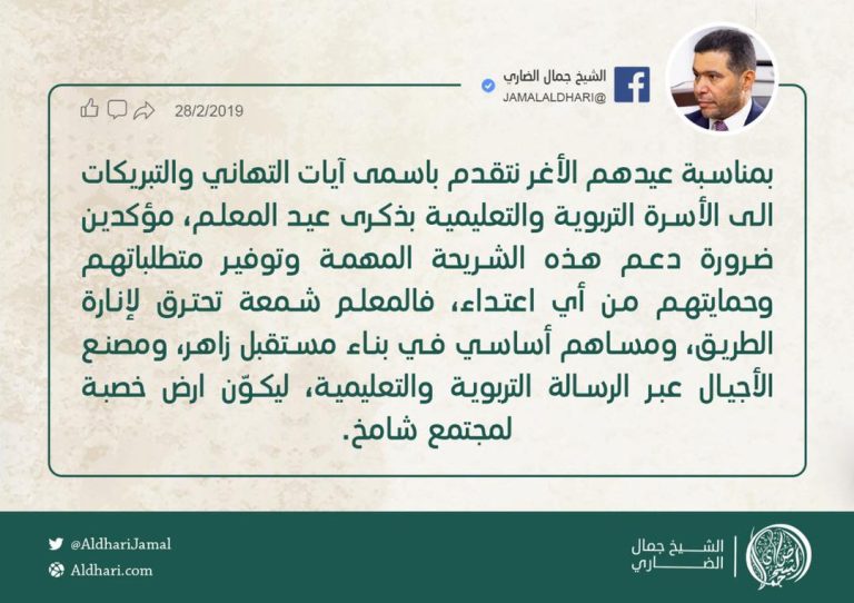 الشيخ جمال الضاري: يجب دعم المعلمين وتوفير متطلباتهم ومنع الاعتداء عليهم