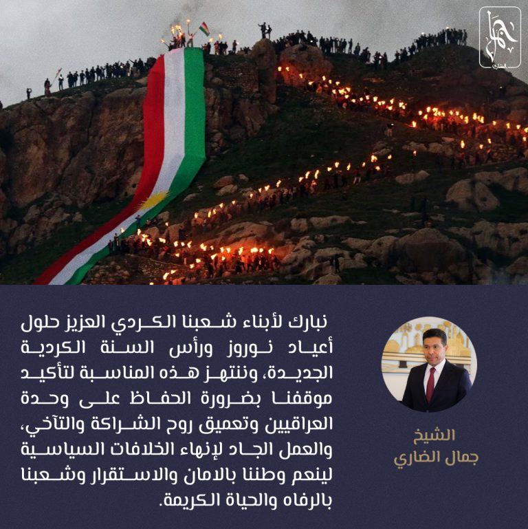 نبارك لأبناء شعبنا الكردي العزيز حلول أعياد نوروز ورأس السنة الكردية الجديدة، وننتهز هذه المناسبة لتأكيد موقفنا بضرورة الحفاظ على وحدة العراقيين وتعميق روح الشراكة والتآخي، والعمل الجاد لإنهاء الخلافات السياسية لينعم وطننا بالامان والاستقرار وشعبنا بالرفاه والحياة الكريمة.