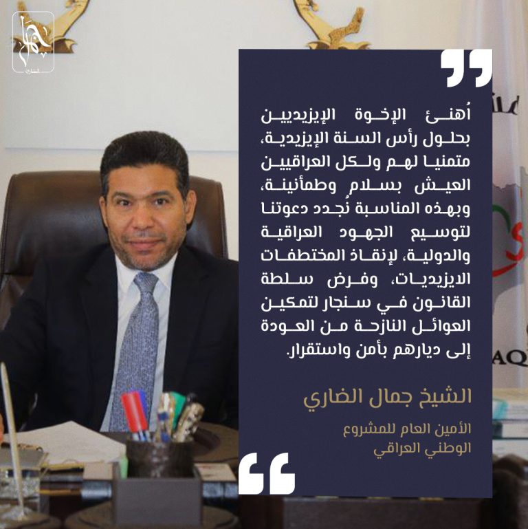 نهنئ الإخوة الإيزيديين بحلول رأس السنة الإيزيدية، متمنياً لهم ولكل العراقيين العيش بسلام وطمأنينة، وبهذه المناسبة نُجدد دعوتنا لتوسيع الجهود العراقية والدولية، لإنقاذ المختطفات الايزيديات، وفرض سلطة القانون في سنجار لتمكين العوائل النازحة من العودة إلى ديارهم بأمن واستقرار.