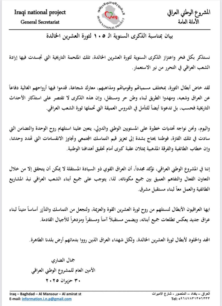 ايها العراقيون الأبطال لنستلهم من روح ثورة العشرين القوة والعزيمة، ولنجعل من التماسك والتآزر أساساً متيناً لبناء عراق جديد يعكس تطلعات جميع أبنائه، ويضمن مستقبلاً آمناً ومستقراً ومزدهراً للأجيال القادمة.
