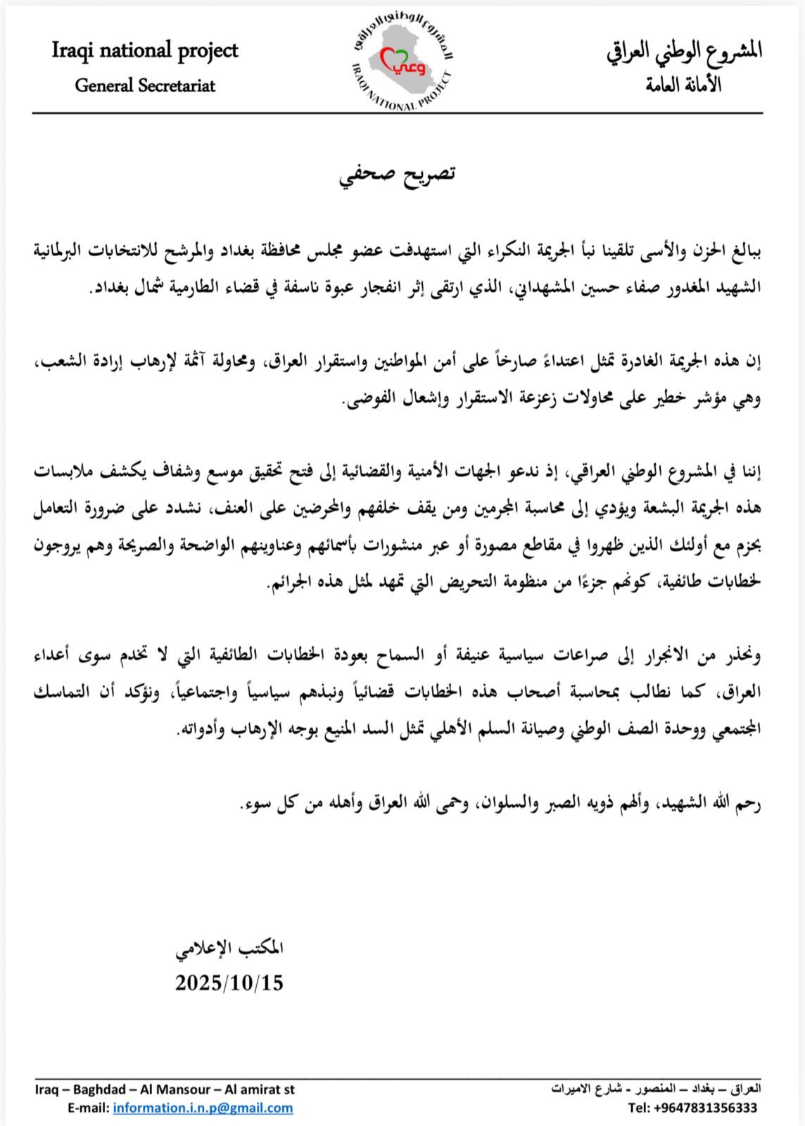 إن هذه الجريمة الغادرة تمثل اعتداءً صارخاً على أمن المواطنين واستقرار العراق، ومحاولة آثمة لإرهاب إرادة الشعب، وهي مؤشر خطير على محاولات زعزعة الاستقرار وإشعال الفوضى.
